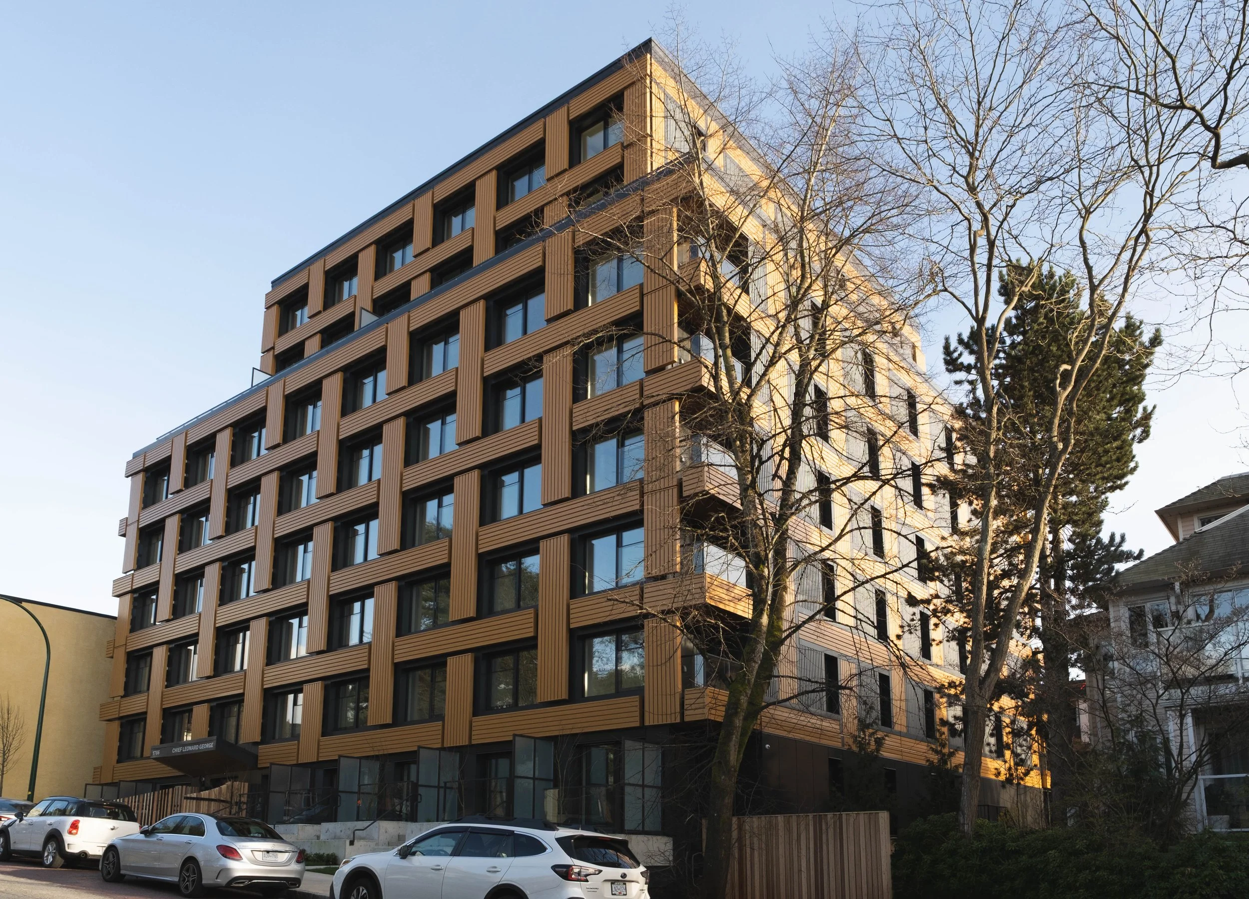 The CLT envelope panels feature a distinctive façade design inspired by the Coast Salish tradition of basket weaving. First Nations motifs integrated into the façade and surrounding landscaping further reflect and honour the cultural identity of the building’s future residents.