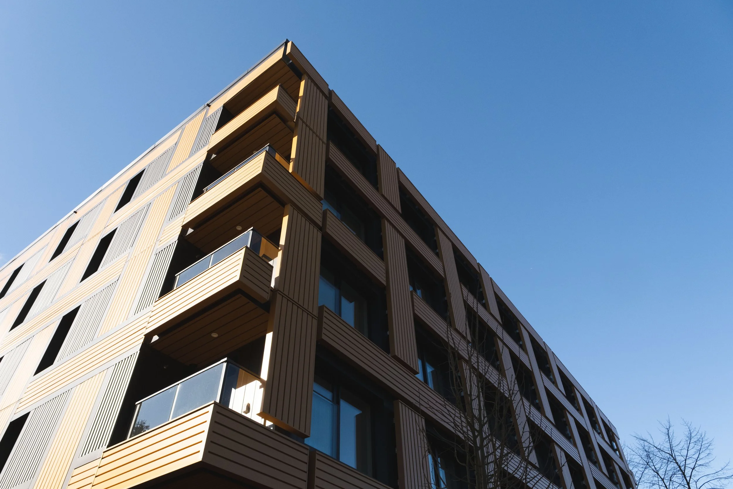 The building is constructed to Passive House standards, incorporating hybrid mass timber technology. Cross-laminated timber (CLT) floor and envelope panels are utilized in conjunction with steel structural columns and a reinforced concrete core housing the elevator shafts and emergency stairwells. This central core enhances the building’s fire resistance and seismic performance.